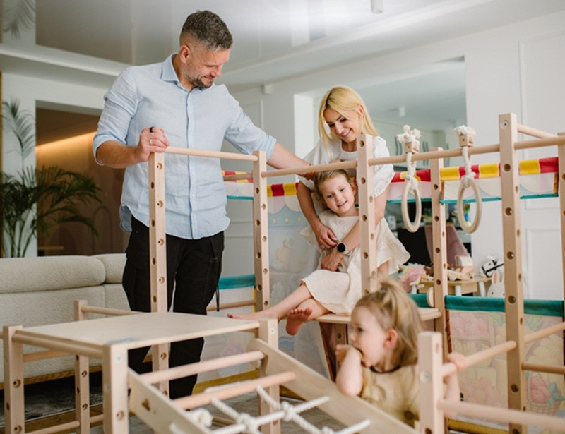 Dobry plac zabaw do domu powinien rozwijać się razem z dzieckiem i odpowiadać na zmieniające się potrzeby ruchowe. Z tego powodu coraz większą popularność zdobywają konstrukcje modułowe. System modułów pozwala stopniowo rozbudowywać zestaw o kolejne elementy, takie jak drabinki, ścianki wspinaczkowe czy zjeżdżalnie. W rozwiązaniach oferowanych przez Kids Jungle konstrukcja opiera się na systemie słupków z otworami oraz dopasowanych drążków. Taki sposób montażu umożliwia szybkie modyfikowanie układu bez konieczności wiercenia w ścianach. Plac zabaw można więc dopasować do przestrzeni w pokoju dziecka lub salonie. Modułowa forma pozwala także na zmianę konfiguracji wraz z rozwojem umiejętności malucha.