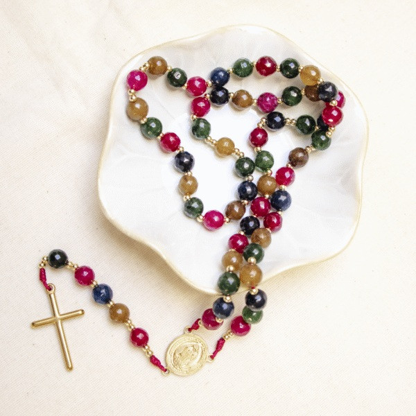 Przykładem jest różaniec z lawy wulkanicznej w kolorze morskim, gdzie kamień który powstaje w czasie i w ogniu mocno koresponduje z sensem modlitwy, która jest dojrzewaniem, hartowaniem serca, szukaniem stałości mimo burz. Morski kolor przywodzi nam na myśl ukojenie i nadzieję, a łącznik Serce Jezusa kieruje naszą uwagę na miłość, która leczy rany i uczy przebaczenia. Podobne przesłanie niesie różaniec z agatu mszystego z medalem św. Benedykta, z jednej strony zachwyca organiczną strukturą kamienia, z drugiej odsyła do benedyktyńskiej mądrości i duchowej ochrony, która ma zawsze jeden sens - trwać blisko Boga, nie ulec złu, wybierać pokój.